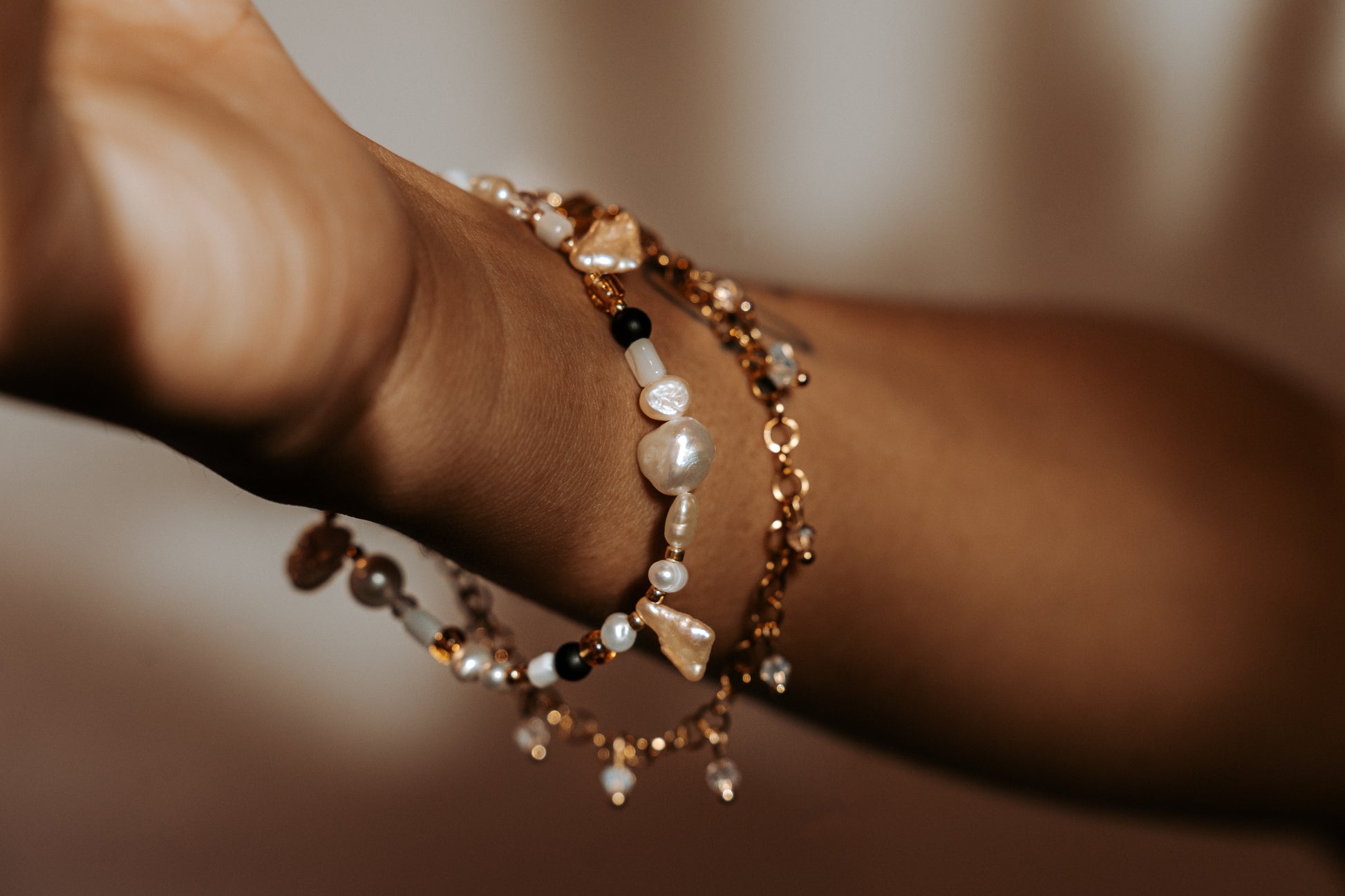 A bracelet crafted with pearls, mother of pearls, glass beads and stainless steal with a gold finish.