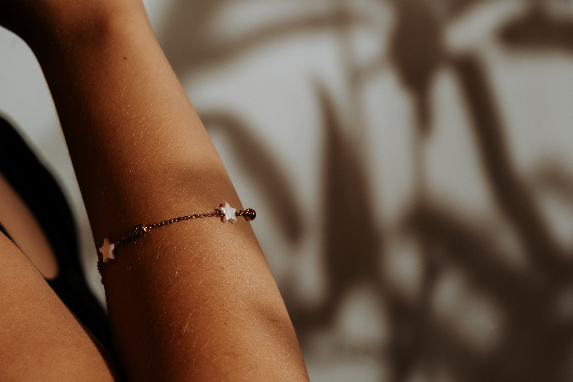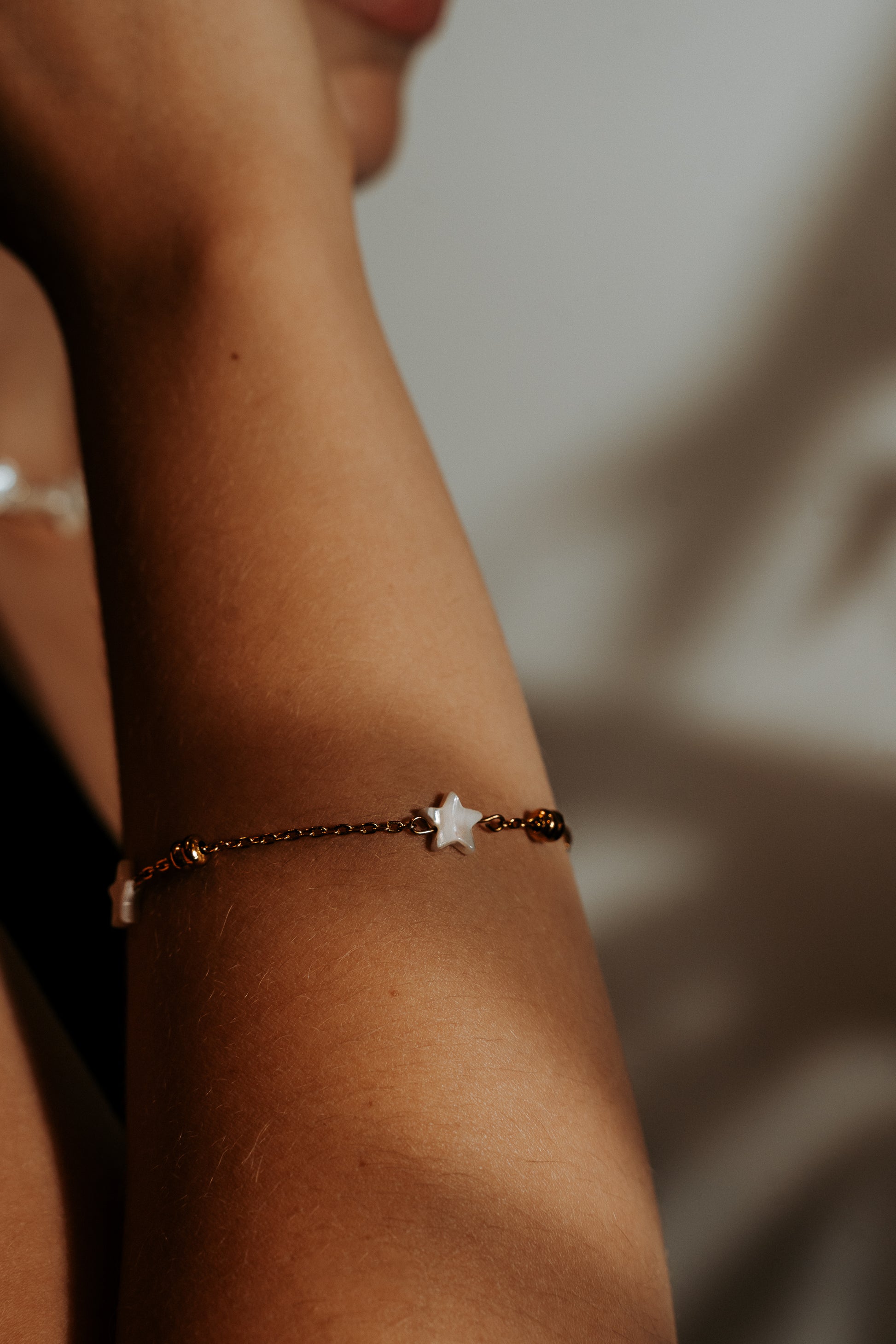 A bracelet crafted with star shapped mother of pearls beads and stainless steal with a gold finish.