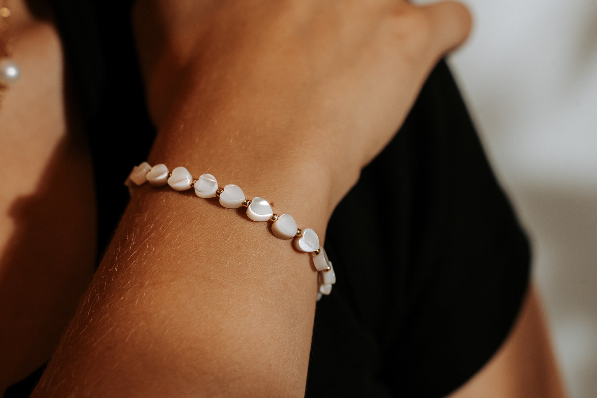 Beaded design featuring mother of pearl hearts and gold beads strung on silk thread and finished with gold stainless steel findings.