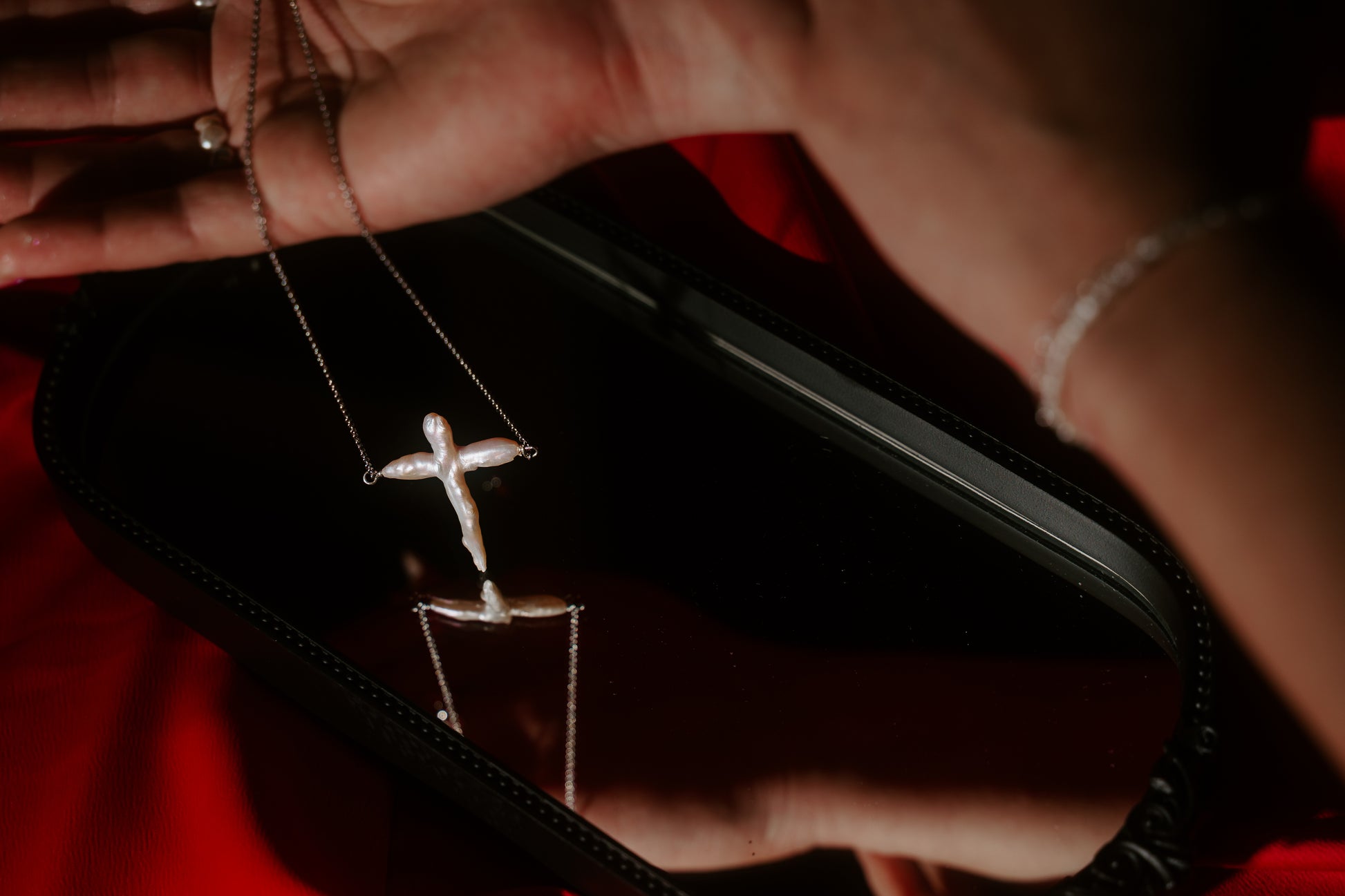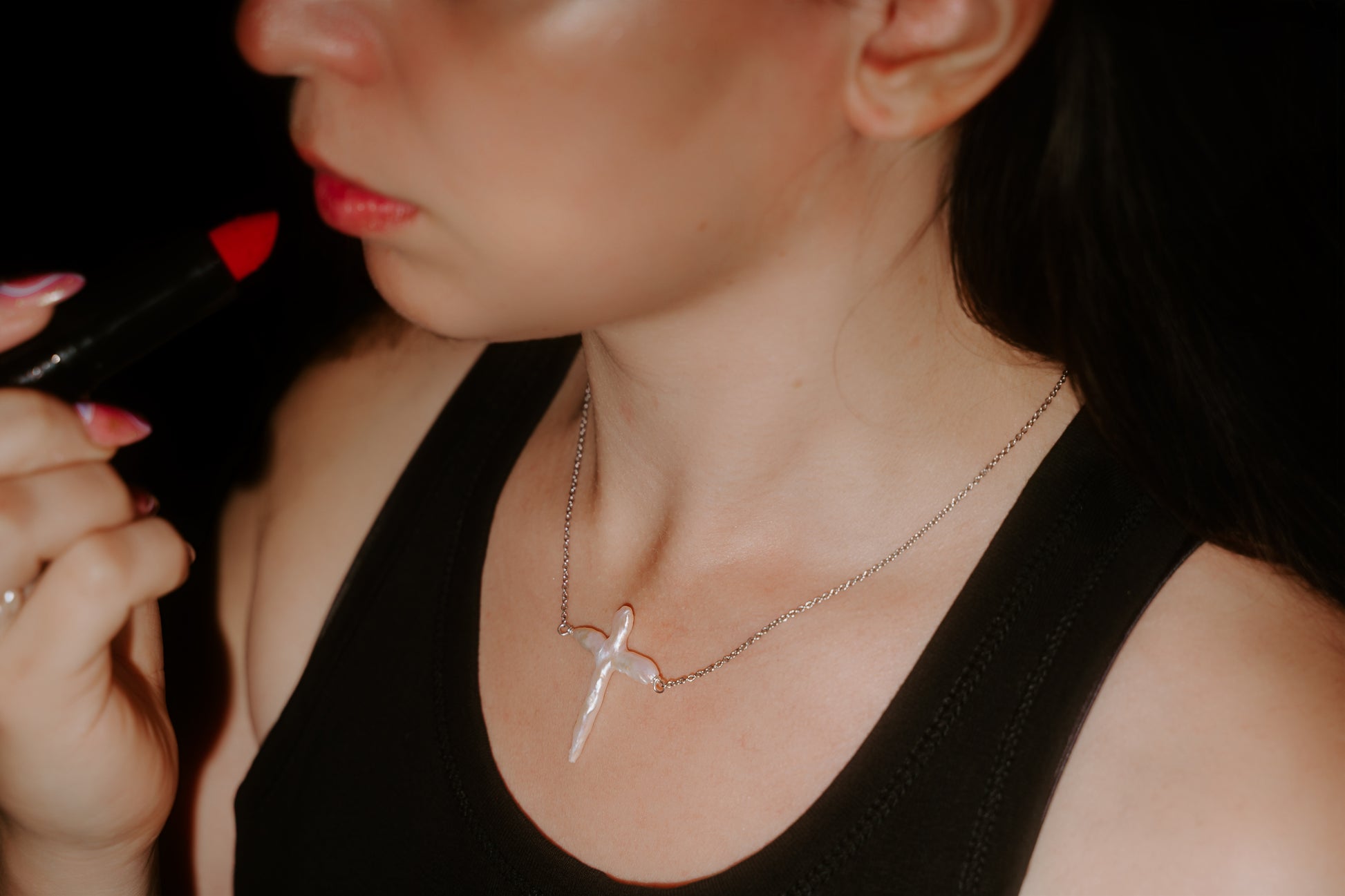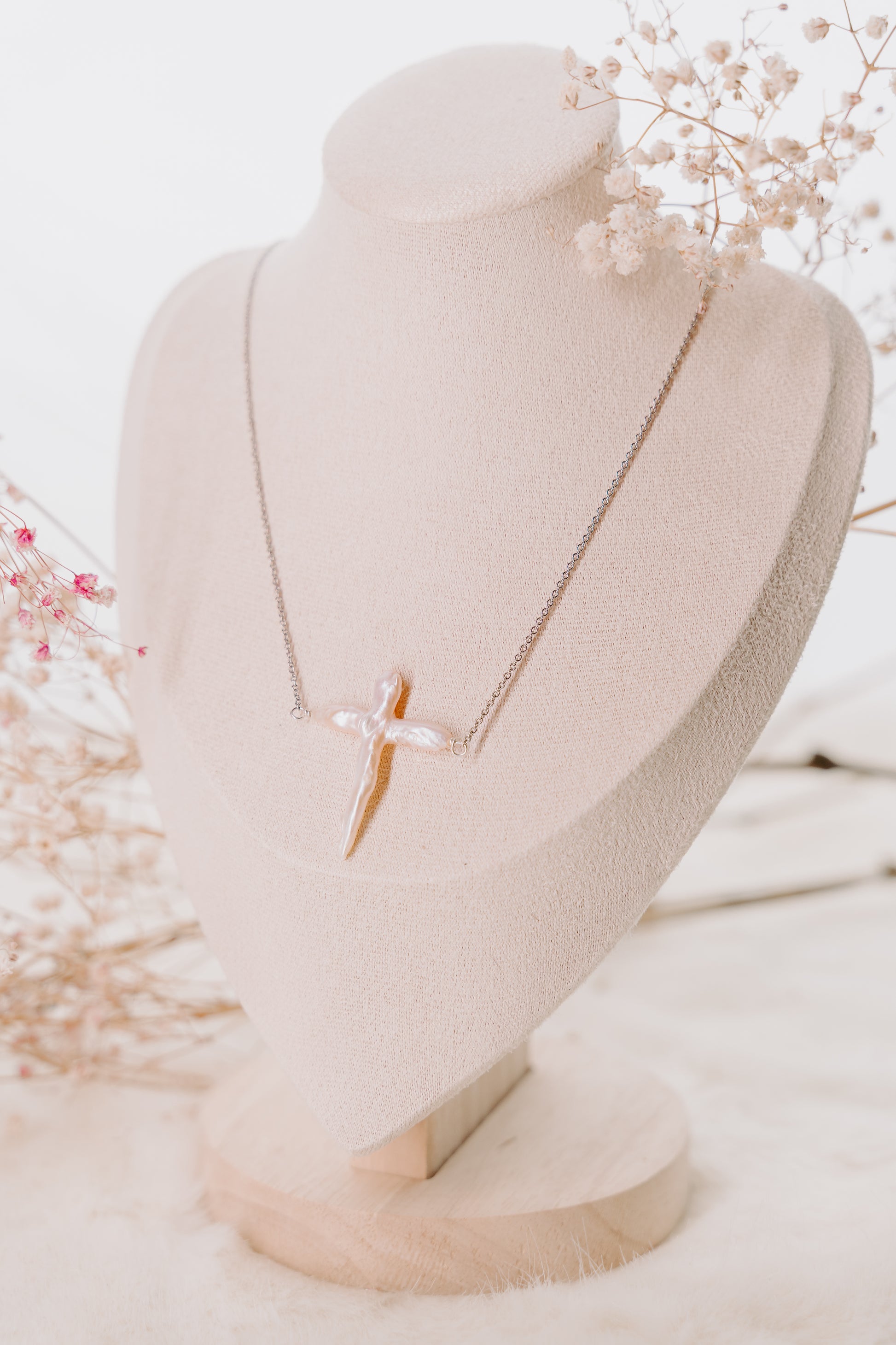 Soft, timeless, and beautifully minimal — this necklace features a natural baroque pearl cross on a classic stainless steel chain. Its simplicity highlights the organic shape of the pearl, making the cross the true focal point of the piece. Elegant yet understated, it’s perfect for everyday wear or as a subtle spiritual accessory.