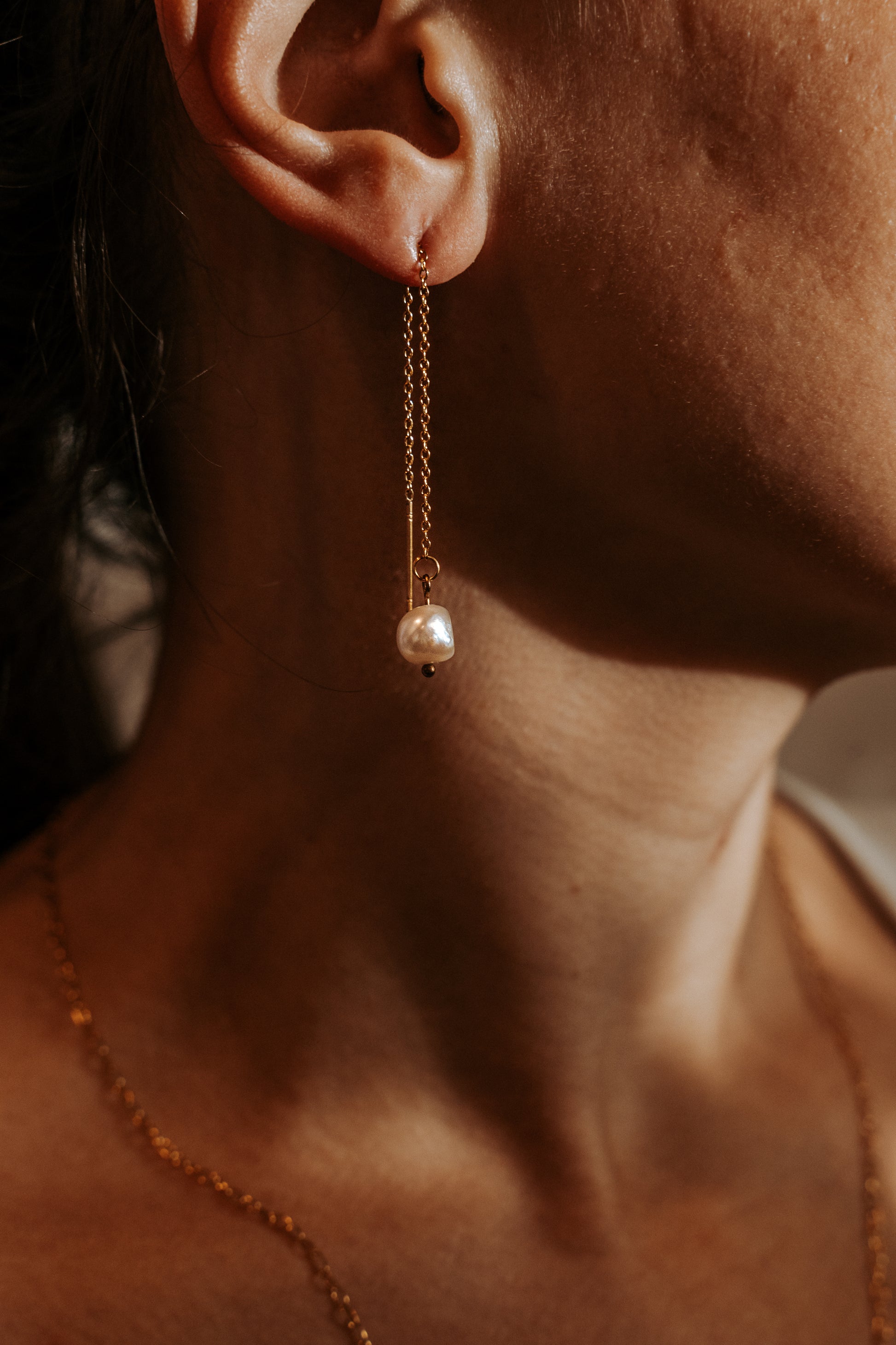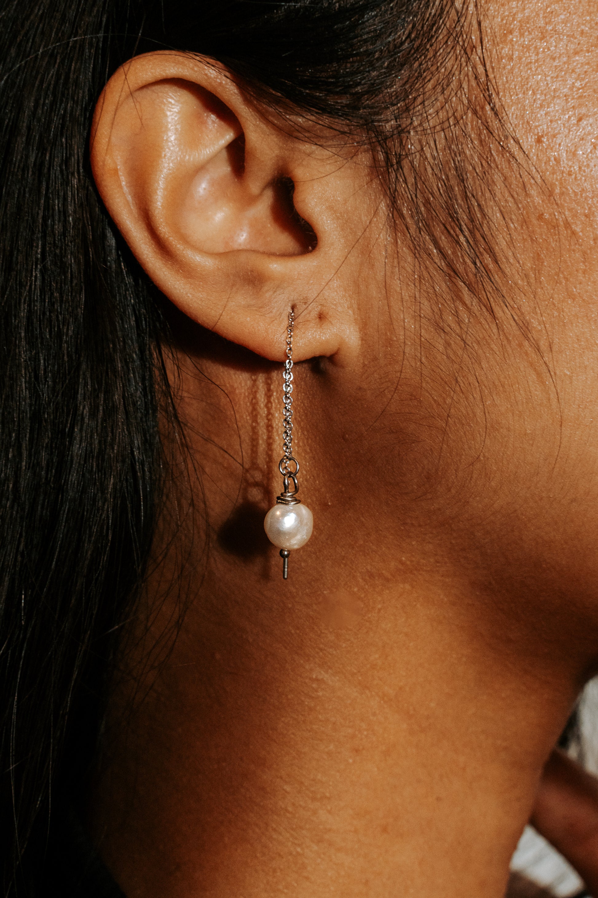 A single pearl dangle suspended from a stainless steel finding, available in silver and gold finishes.