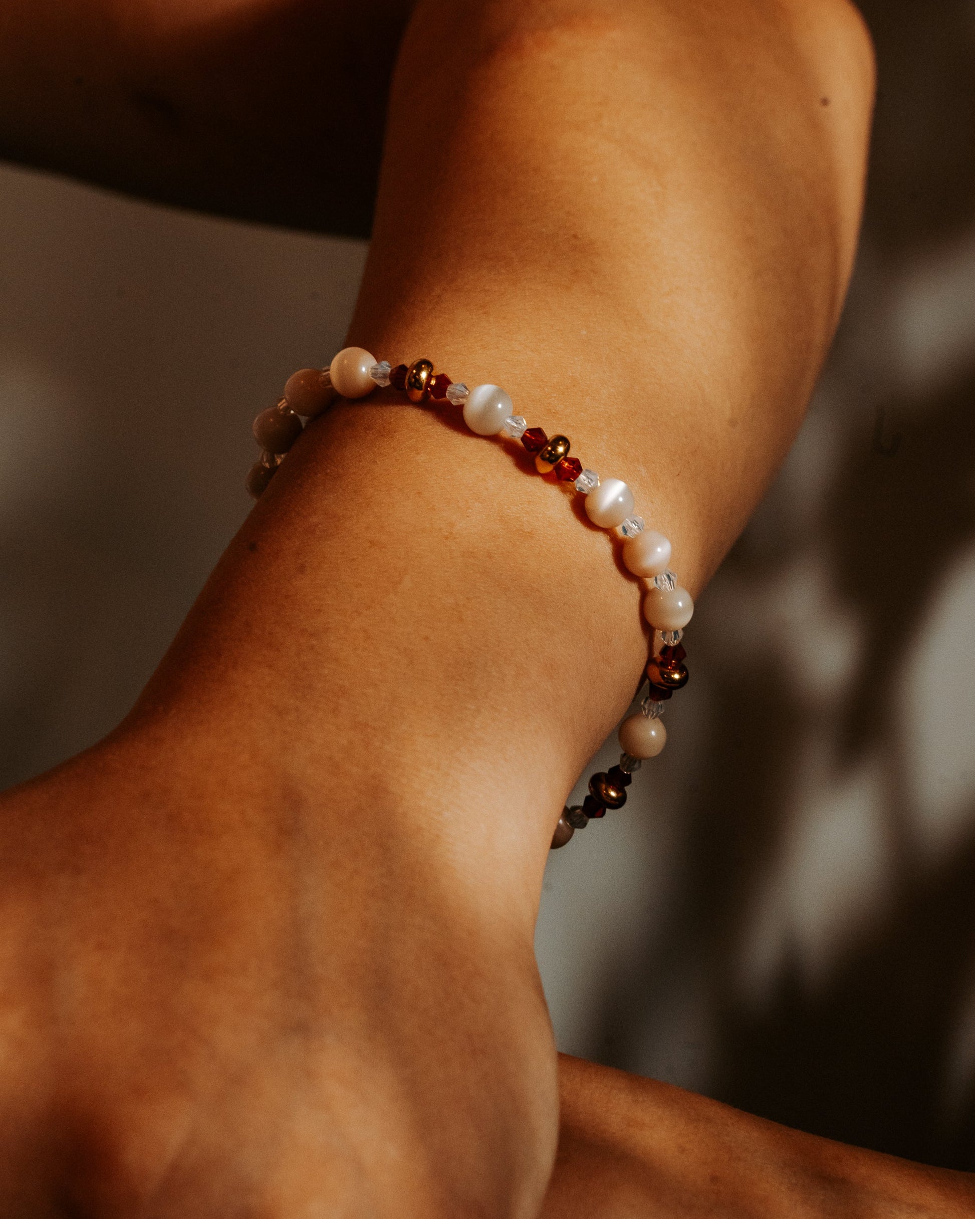 A stylish bracelet featuring a mix of red and clear bicone crystal beads, accented with gold-finished stainless steel findings.