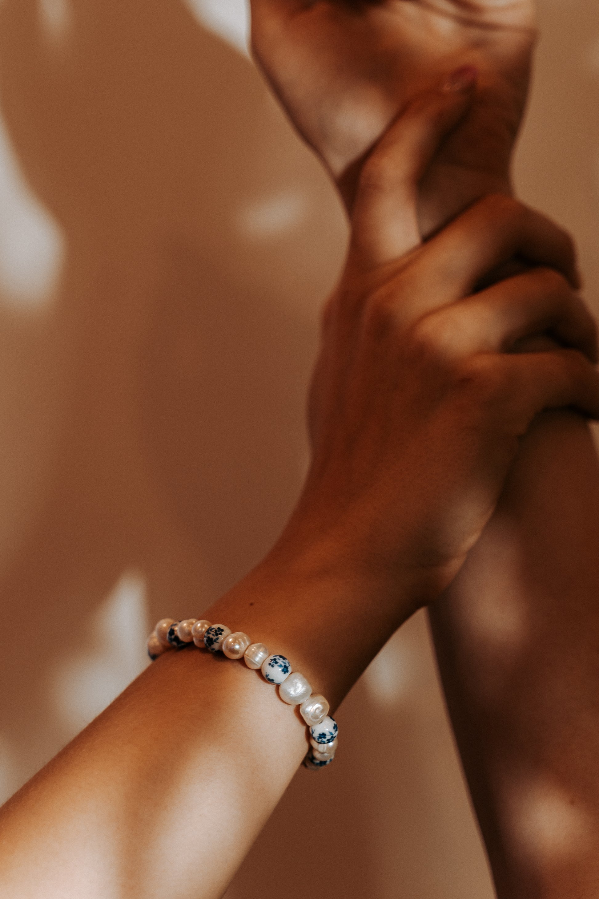 Bracelet featuring two different sizes of pearls, porcelain floral beads, and gold-finished stainless steel findings.